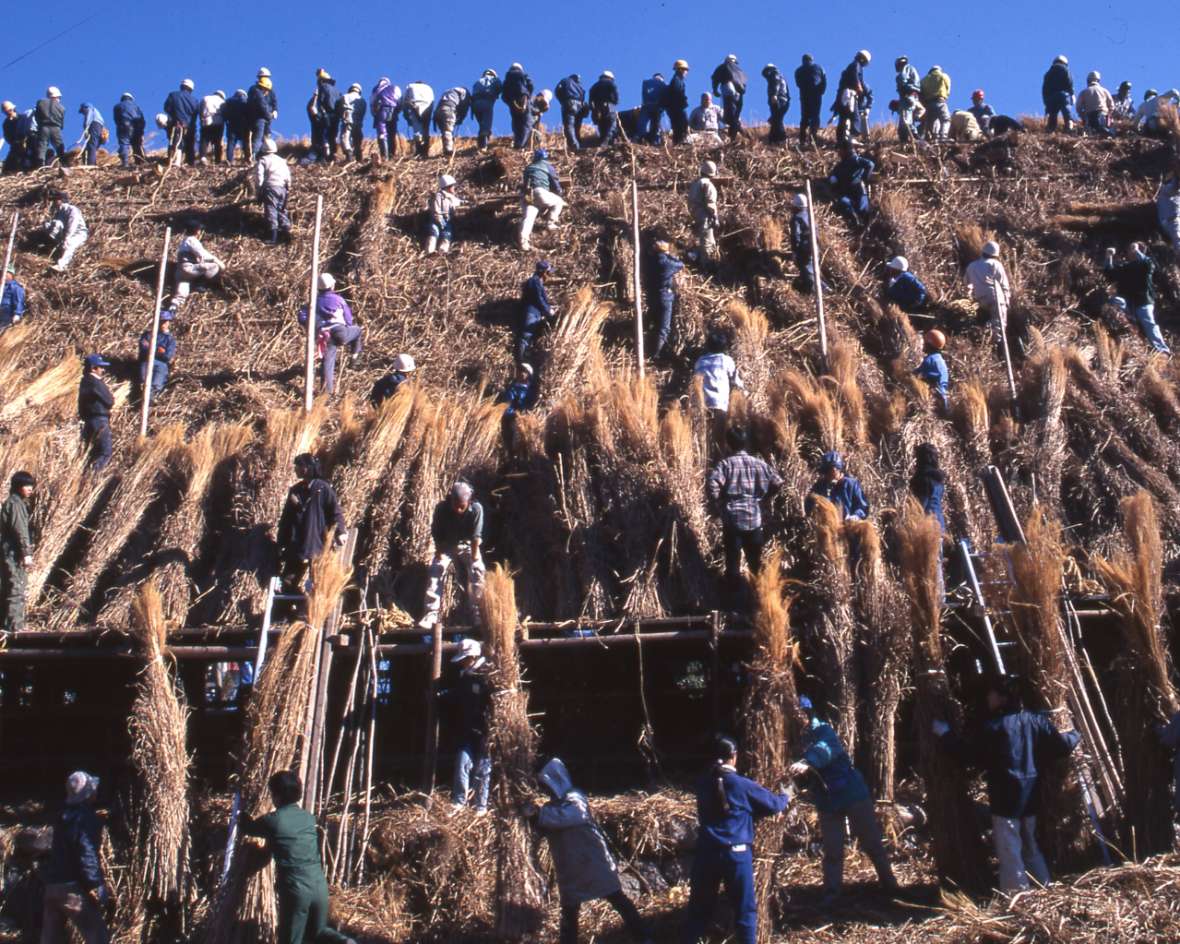 一般社団法人日本茅葺き文化協会は、茅葺き文化と技術の継承と振興をはかり、もって日本文化と地域社会の発展に寄与することを目的に2010年に設立されました。会員は茅葺きや茅刈りの職人、茅葺き民家の所有者、茅葺き集落のある自治体、茅や茅葺きの研究者、そして茅場や茅葺きを愛する市民や団体などで構成されています。茅葺きを通じて、地域環境の保全や生物多様性の維持、そして持続社会の実現に取り組んでいます。